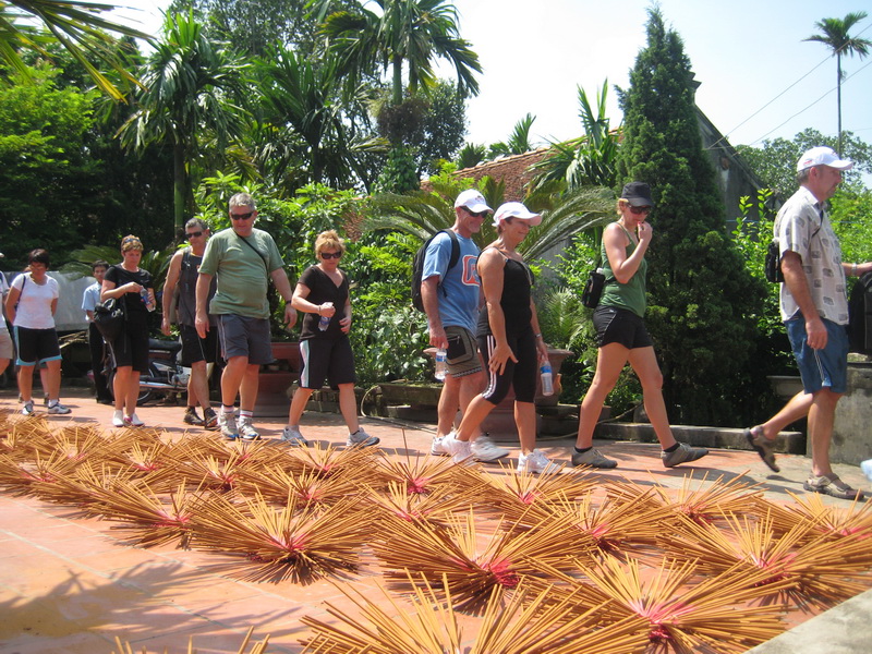 Leaving the Chuong market you cross the Day river on a floating bridge to an other district of Ha Tay province, where the life is a little bit quieter, you will visit some very old communal houses, ride on the dike with rice paddies on both sides.