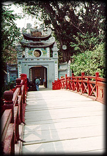 Since then Ngoc Son has gone through many renovations, one of which was the addition of Thap But (Pen Tower) on the hill which was once called Dao Tai. Three words inscribed on the tower "Ta Thien Thanh "or "write on blue sky". Inside the gate a pool resembling the shape of an ink well was added. Beyond the ink well is The Huc bridge or "where the sun light is absorbed". The bridge leads to Dac Nguyet Lau or "Moon Light tower "- Ngoc Son shrine. Beyond the gates to the shrine, there are two walls called bang Rong and bang Ho (dragon and tiger slate) where the names of those who passed the national test are inscribed.