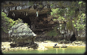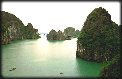 The natural wonder of Halong Bay, renowned for its spectacular scenery and limestone grottos and caves, has been declared a UNESCO World Heritage Site. The bay is peppered with over 3,000 tiny islands emerging almost mystically out of the pea green waters of the Gulf of Tonkin, scoured by wind and wave erosion to form dramatic rock shapes, many of which contain caves filled with stalagmites and stalactites. Many of the islands have been named for their astonishing resemblance to their namesakes, such as Dragon, Incense Burner, Pair of Roosters and Man's Head Islands. The weird protuberances have been at the source of several local legends, particularly about the dragon whose thrashing tail created the bay and its islands. The name Ha Long means 'where the dragon descended into the sea'. The most impressive cave is the Hang Dau Go (Grotto of the Wooden Stakes), an extensive grotto with rock formations presenting various eerie images in the mysterious light. It was named from the Battle of 1288 when General Tran Hung Dao prepared hundreds of stakes to be planted in the riverbed of the largest chamber to counter a boat attack. Nearby the beautiful Hang Thien Cung cave is famous for its sparkling stalagmites and stalactites.